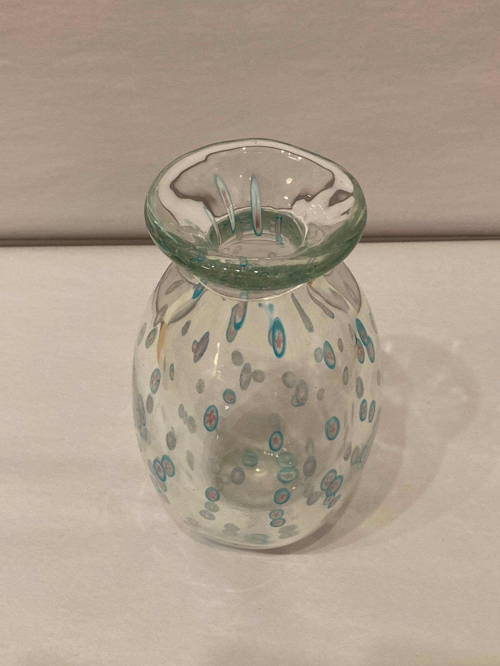 Beautiful blown glass vase with tiny detail pattern in blue and orange.